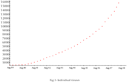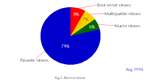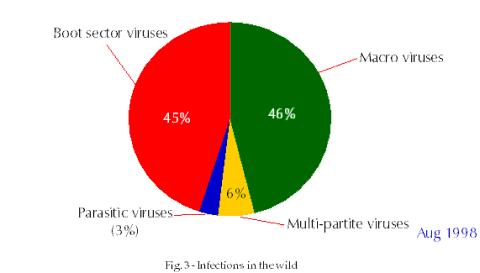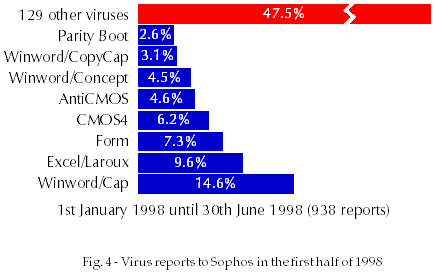 Over 16000 viruses currently exist (August 1998, Fig. 1). Most of these are parasitic viruses (aka file or program viruses), accounting for 79% of the total, about 8% are pure boot sector viruses, 7% are multipartite viruses (infecting both boot sectors and programs) and 6% are macro viruses (Fig. 2). Parasitic viruses are currently responsible for only 3% of all infections, multipartite viruses for 6%, macro viruses for 46% and boot sector viruses for 45% (Fig. 3). The most commonly encountered virus is Winword/Cap, responsible for about 15% of all infections reported to Sophos* between January and June 1998 (Fig. 4). The second most common virus is Excel/Laroux, responsible for about 10% of infections over the same period.